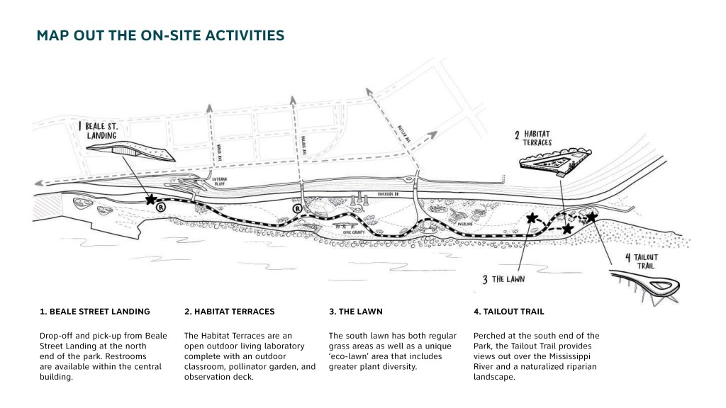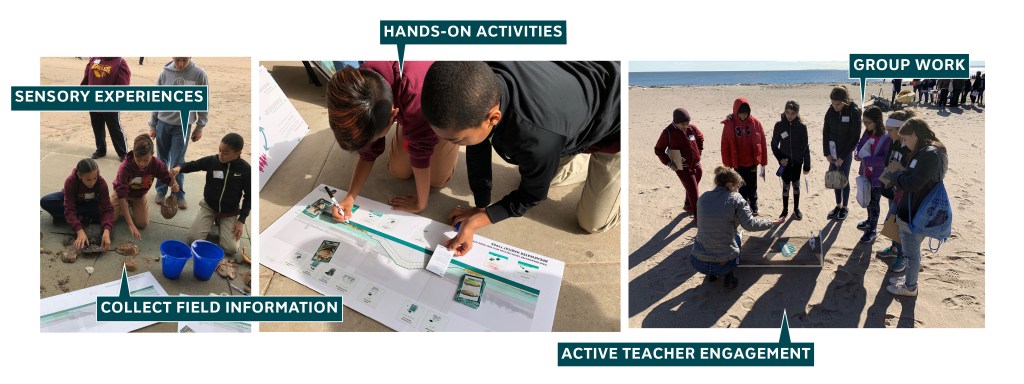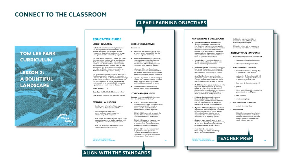 Classroom-Integrated: A curriculum designed for classroom integration includes more in-depth, hands-on activities—both in-class and outdoors—that explore environmental topics through the lens of a local park or landscape. These align with state science standards and are intended to be embedded into a school’s STEM/STEAM curriculum, supporting more outdoor learning. This approach is more time-intensive, requires commitment from teachers or schools, includes teacher training and professional development, has repeated site visits, and may integrate a hands-on service project. This must be developed by a larger, collaborative team that includes curriculum specialists and landscape architects.